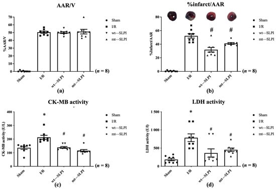 The serum LDH and CK-MB activity were measured at the end of the study protocol. The results showed that CK-MB activity in I/R group was significantly increased when compared with the sham group (213.1 ± 14.48 vs. 135.9 ± 11.42 U/L), p < 0.05) (Figure 4c). Treatment with both wt-SLPI and mt-SLPI could significantly reduce CK-MB activity when compared with I/R group (138.8 ± 10.08 and 122.5 ± 7.34 vs. 213.1 ± 14.48 U/L), p < 0.05) (Figure 4c).