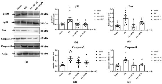 The signal transduction that responds to I/R in the presence and absence of wt-SLPI and mt-SLPI at the onset of reperfusion was determined by Western blot analysis. The results showed that there was a significant activation of p38 MAPK in the I/R group when compared with the sham group (1.07 ± 0.18 vs. 0.50 ± 0.07, p < 0.05) (Figure 5a). Treatment of both wt-SLPI and mt-SLPI at the onset of reperfusion could significantly reduce phosphorylated p38 MAPK when compared with the I/R group (0.49 ± 0.09 and 0.50 ± 0.09 vs. 1.07 ± 0.18, p < 0.05). Similar results were observed in the apoptotic regulatory pathway, including Bax, cleaved caspase-3, and total caspase-8. The results showed that I/R injury significantly increased pro-apoptotic proteins level when compared with the sham group (Bax: 0.28 ± 0.04 vs. 0.11 ± 0.02, cleaved caspase-3: 0.49 ± 0.06 vs. 0.24 ± 0.02, total caspase-8: 0.79 ± 0.03 vs. 0.39 ± 0.03, p < 0.05) (Figure 5b–d). Treatment of both wt-SLPI and mt-SLPI significantly reduced the pro-apoptotic proteins level when compared with the I/R group (Bax: 0.10 ± 0.02 and 0.15 ± 0.01 vs. 0.28 ± 0.04, cleaved caspase-3: 0.32 ± 0.04 and 0.35 ± 0.09 vs. 0.49 ± 0.06 total caspase-8: 0.46 ± 0.03 and 0.46 ± 0.03 vs. 0.79 ± 0.03, p < 0.05) (Figure 5b–d).