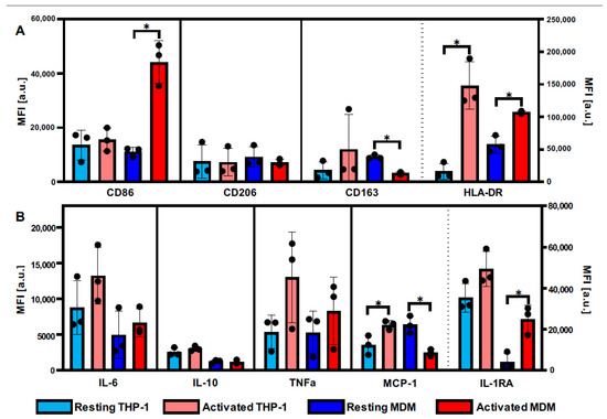THP-1-derived macrophages and MDMs differ in their molecular activation patterns. Expression of (A) surface antigens and (B) cytokines of THP-1 (light colors) and MDMs (intense colors) before (blue) and after (red) LPS-IFNγ activation. Data represent mean fluorescence intensity (MFI) values ± SD; n = 3; pairwise comparison via student’s t-test, * p ≤ 0.05. Boxplots after the dotted line are assigned to the right y-axis. HLA-DR: human leukocyte antigen DR isotypes; IL: interleukin; TNF: tumor necrosis factor; MCP: monocyte chemoattractant protein; IL-1RA: interleukin 1 receptor antagonist.