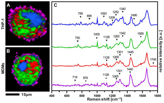 THP-1 and PBMC-derived monocytes were matured into M0 and M1 macrophages and characterized by RM and Raman imaging. Raman scans were segmented by TCA into false color-coded intensity distribution heat maps (Figure 2A,B). Four major spectral components were identified, localizing nucleic acids (blue), cytoplasm (green), and two lipid-related components—referred to as lipids A (red) and lipids B (pink) (Figure 2C).