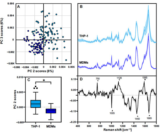 PCA comparison of cytoplasm features identifies differences in the molecular composition between resting THP-1 and MDMs. (A) PC 2/PC 3 scores plot of single-cell cytoplasm spectra extracted from THP-1 (light blue) and MDMs (blue) demonstrates a separation of both groups. (B) Mean cytoplasm spectra from THP-1 (light blue) and MDMs (blue). (C) Statistical analysis of the PC 2 score values reveals significant differences within the cytoplasm from both cell sources. Boxplots show mean single cell PC 2 score values ± SD, n = 90, student’s t-test, * p ≤ 0.05. (D) The corresponding PC 2 loadings plot exhibits the molecular vibrations differentiating the cytoplasmic composition between both cell types.