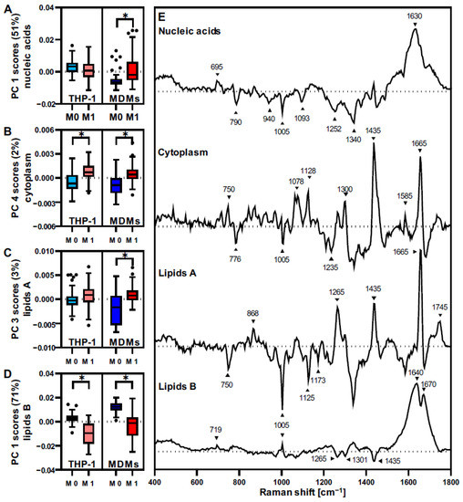 To have a deeper insight into the molecular protein modifications driven by the LPS-IFNγ proinflammatory response, independent PCAs including only the data from one cell type were performed. MDMs or THP-1 were separately analyzed with a PCA from extracted spectra from cytoplasm before and after LPS-IFNγ activation (Figure 5). PCA score graphs for THP-1 (Figure 5A) and MDMs (Figure 5B) demonstrated the strongest separation between M0 and M1 macrophages. THP-1 clustering was described by PC 4 with an explained variance of 2%, and MDMs showed a separation in PC 2 with 4% of the total variance. Statistical analysis from the selected PCs scores confirmed that the separation seen on the score graphs was significant (Figure 5C,D). The respective loadings plots for both PCAs (Figure 5E) showed differences in the cytoplasmic molecular composition induced by LPS-INFγ activation for THP-1 and MDMs. However, the separation and assigned molecular changes were driven by different spectral patterns for the two groups.