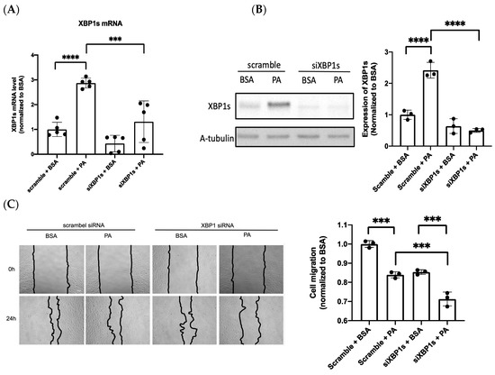 The literature reviews implicate that XBP1s has a protective role in vascular homeostasis and disease [48,49]. Additionally, the latest study reveals that XBP1s could activate autophagy through Transcription factor EB (TFEB), which may contribute to glucose tolerance and steatosis in in vivo and in vitro studies [50]. During Japanese encephalitis virus infection in the neuronal cells, activated autophagy by XBP1s and ATF6 could attenuate virus-induced cell death [51]. In cancer therapy, disulfiram form complex with copper (DSF/Cu) induce the apoptosis of cancer cell lines through activated IRE1–XBP1s regulated autophagy [52]. In addition, XBP1s induces autophagy in endothelial cells by directly binding to the BECLIN-1 gene promoter [53]. These previous studies were consistent with our result showing that the silencing of XBP1 decreases the expression of beclin-1 (Figure 4C) and attenuates cell migration (Figure 3C). Taken together, our result shows a similar protective role of XBP1s-regulated autophagy against PA-induced vascular lipotoxicity. However, Zeng et al. demonstrated that XBP1 overexpression downregulated VE-cadherin expression and induced apoptosis in endothelial cells [17]. Moreover, the activation of XBP1s leads to parallel increases in the expression of the monocyte chemoattractant protein 1 (MCP-1) via histone methylation, which is related to the pathogenesis of diabetic nephropathy [54]. These findings indicate a two-pronged influence of XBP1s on endothelial cells. Further investigations are required for elucidating this critical point and a new pharmacological strategies involving endothelial cells.