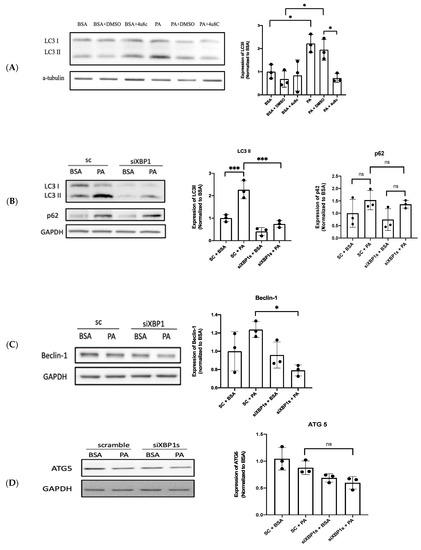 PA induces Ca2+-dependent autophagy, which results in programed necrosis (necroptosis) in endothelial cells [30]. However, Zhou et al. demonstrated that resveratrol attenuates endothelial oxidative injury by inducing autophagy [33], and ER stress-induced autophagy is associated with cytoprotection [34]. LC3 II and p62 are autophagy markers, of which LC3 II participates in the membrane formation of autophagosomes and p62 binds with ubiquitinated protein during autophagy [35]. In addition, beclin-1 is one of the components of class III PI(3)K complexes that are involved in the maturation of autophagosome [36] and autophagy-related protein 5 (ATG5) conjugated autophagy-related protein 12–autophagy-related protein 16 (ATG12–ATG16) complex promotes autophagosome formation [37]. Then, we investigated the role of PA-induced autophagy further by using Western blot analysis through these autophagy-related markers. The results show that the expression of LC3 II increases after PA exposure, which decreases after co-treatment with 4-methyl umbelliferone 8-carbaldehyde (4u8c), which is a selective IRE1α inhibitor (Figure 4A). We then investigated whether XBP1s triggered the autophagic signaling pathway under lipotoxic conditions through the silencing of XBP1s. The expressions of LC3 II and beclin-1 decreased after the silencing of XBP1s (Figure 4B,C). The expression of ATG 5 decreased after the silencing of XBP1s, but this was statistically insignificant (Figure 4D). The role of autophagy in endothelial cells was evaluated using the wound healing assay. Autophagy was inhibited by 3-methyladenine (3-MA) (Figure 4E), and the inhibition of autophagy decreased cell migration after PA exposure (Figure 4F). Collectively, these results indicate that XBP1s protects endothelial cells via autophagy under lipotoxic conditions through the silencing of XBP1s.
