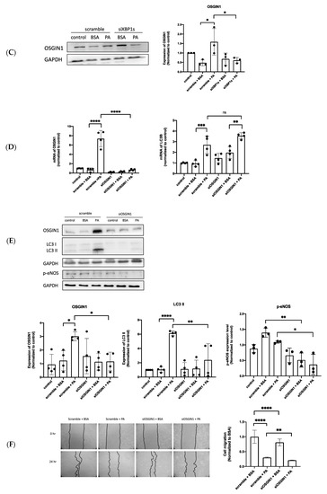 To search for the XBP1s-regulated molecular signaling in response to PA, RNA-seq analysis was used to find the target genes of XBP1s by the silencing of XBP1s after PA treatment. The XBP1s target genes were selected at the threshold > 2.0 log2 fold change in the condition of silencing XBP1s, compared to normal cells. The result show that 19 genes meet the criteria described in the heat map with log2 fold change (Figure 5A) and the Differentially Expressed Gene (DEGs) in BSA vs. PA-treated group was shown in supplementary Table S1. We further validated four interesting candidate target genes: angiopoietin-like 4, OSGIN1, cyclin D2, and thioredoxin-interacting protein (ANGPTL4, OSGIN1, CCND2, and TXNIP). Among these potential genes, OSGIN1 was the most remarkably increased in mRNA level (Figure 5B). From a previous study, oxidized phospholipid enhanced the expression of OSGIN1 in the human aortic endothelial cells [20], but the molecular mechanism of OSGIN1 remains unclear under free fatty acid-induced vascular lipotoxicity. We also found that PA promoted OSGIN1 expression and decreased the expression of OSGIN1 after the silencing of XBP1s in Western blot analysis (Figure 5C). This result determines that XBP1s regulates OSGIN1. The silencing of OSGIN1 via siRNA transfection was explored to elucidate its role and molecular function in vascular endothelial cells. The result shows that OSGIN1 could be silenced effectively by siRNA at the mRNA level. The LC3 B mRNA level increased after silencing OSGIN1, but there was no statistical significance (Figure 5D). Then, we found the decreased protein expression of p-eNOS and LC3 II after silencing OSGIN1 (Figure 5E). Meanwhile, the silencing of OSGIN1 suppressed cell migration under BSA and PA treatment (Figure 5F). Collectively, these results indicate that the PA-enhanced expression of OSGIN1 was regulated by XBP1s, which obviously modulate cell migration through autophagy. Additionally, OSGIN1 could regulate endothelial cell migration via p-eNOS expression by evidence of silenced OSGIN1.