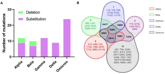 Mutations in spike glycoprotein. (A) Total number of mutations (Substitutions in pink and deletions in green) of each spike glycoprotein from SARS-CoV-2 variants; (B) Venn diagram showing the shared mutations (by residue position) between variants.
