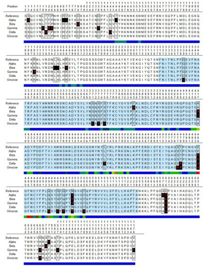 Protein sequences of SARS-CoV-2 variants were obtained after the genome sequences of the five SARS-CoV-2 VOCs: Alpha, Beta, Gamma, Delta and Omicron (Table 1). The genome sequences of these variants were identified and obtained from Global Initiative on Sharing All Influenza Data (GISAID) EpiCoVTM Database (https://www.gisaid.org/, accessed on 15 February 2022), considering only complete sequences (>29,000 bp) and excluding those entries with low coverage (>5% undefined bases) to discard poor quality sequences. To identify the mutations in the selected variants genomes, the Bioinformatic tool Nextclade v.1.14.0 was used (https://clades.nextstrain.org/, accessed on 17 Frebruary 2022). Nextclade is a Web application that can identify differences between a query and a reference sequence (SARS-CoV-2 isolate Wuhan-Hu-1, NCBI accession NC_045512). Subsequently, protein sequences of membrane spike glycoprotein (NCBI accession YP_009724390.1) for SARS-CoV-2 variants of the study were generated.