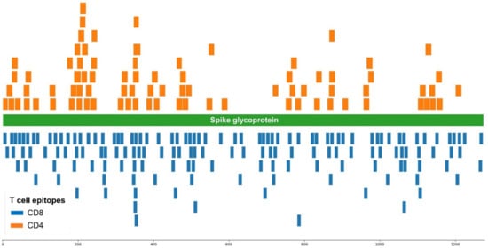 CD4 and CD8 T cell epitopes mapping on the spike protein were retrieved by querying the IEDB (https://www.iedb.org/, accessed on 25 February 2022). To identify CD8 T cell epitopes on SARS-CoV-2 spike glycoprotein, IEDB search parameters were restricted to infectious disease, human host, positive T cell assay and binding to MHC class I. Only those epitopes with nine residues were considered. To select CD4 T cell epitopes on SARS-CoV-2 spike glycoprotein, search parameters were restricted to infectious disease, human host, positive T cell assay and binding to MHC class II. Only epitopes larger than 11 and shorter or equal to 18 residues were considered.