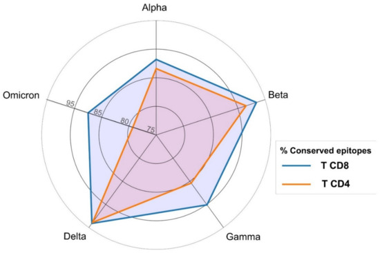 We verified that all the selected T cell epitopes correspond exactly to the reference SARS-CoV-2 spike protein and examined if they were mutated in SARS-CoV-2 VOCs. The result of the analysis for each individual CD8 and CD4 T cell epitope is provided in Supplementary Materials Tables S2 and S3, respectively, and the percentage of conserved epitopes in each variant is shown in Figure 5. Clearly, T cell epitopes are not affected to a great extent by mutations, and the percentage of mutated CD8 or CD4 T cell epitopes is lower than 21% in all SARS-CoV2 VOCs. The variant with less mutated T cell epitopes is Delta (94.1% of CD8 and 93.9% of CD4 T cell epitopes are mutation free, conserved) while Omicron has the largest percentage of mutated CD8 and CD4 epitopes, yet 87.5% and 79.3% of CD8 and CD4 T cell epitopes, respectively, are conserved.