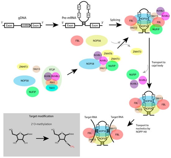 Biogenesis of C/D box snoRNAs. C/D box snoRNAs are located near the 3′ splice site of the intron. During transcription, C/D box snoRNAs form their characteristic secondary RNA structure. The formation of C/D box snoRNPs requires different assembly factors, including the RUVBL1-RUVBL2-TAH1-PIH1 (R2TP) complex [,]. The RUVBL1 and RUVBL2 subunits of the R2TP complex bind, together with nuclear fragile X mental-retardation-interacting protein 1 (NUFIP), zinc finger HIT domain-containing protein 3 (ZNHIT3), and ZNHIT6, the core protein nucleolar protein 58 (NOP58) and small nuclear ribonucleoprotein 13 (SNU13) to form a new protein complex []. This newly assembled complex then binds and recruits fibrilarin (FBL), which replaces ZNHIT3 in the complex. The complex binds the C/D box snoRNA sequence during the splicing of the pre-mRNA. RUVBL1, RUVBL2, NUFIP, and ZNHIT6 are released from the complex and the immature snoRNP is translocated to the Cajal body for further maturation before it is translocated to the nucleolus. The mature C/D box snoRNAs are associated with four proteins, SNU13, NOP56, NOP58, and FBL [,]. C/D box snoRNA guide the 2′O-methylation of targets rRNAs.