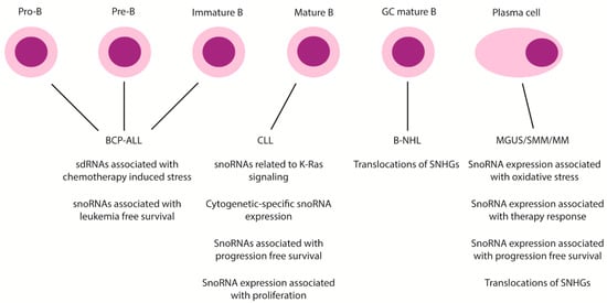 Several studies have shown that snoRNAs are involved in oncogenesis [,,,,]. For instance, a large study including over 10,000 samples across 31 cancer types identified 46 snoRNAs that showed clinical relevance in at least 12 cancer types. SnoRNAs were associated with DNA damage response and mitotic nuclear division, suggesting a role in cancer initiation and progression. Furthermore, genes that are associated with the biogenesis and functions of snoRNAs were dysregulated in multiple types of cancer []. Other studies, involving colorectal carcinoma and pancreatic cancer, showed that snoRNAs were dysregulated and were involved in disease progression [,]. In this review, we discuss the role of snoRNAs in normal B-cell differentiation as well as their dysregulation in various B-cell malignancies.