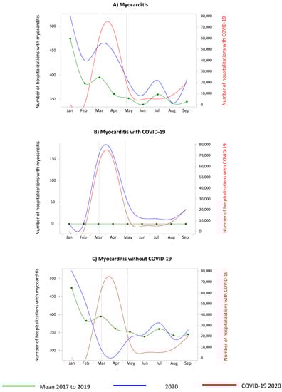 The overall number of myocarditis cases (Figure 1A) was higher in 2020 (January–September 2020) (3727) when compared with the mean number of cases in 2017–2019 (3345, i.e., an increase of 11.4%) during the entire study period, with a slow decrease from May.