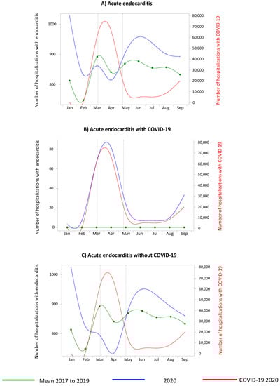 The overall number of endocarditis cases (Figure 2A) was higher in 2020 (January–September 2020) (8128) when compared with the mean number from 2017 to 2019 (7580, i.e., an increase of 7.2%). During the lockdown in 2020, the overall number of hospital stays for endocarditis was slightly inferior in March and April compared with the mean from 2017 to 2019 (1677 versus 1733, i.e., a decrease of 3.2%), but the number of cases surpassed the rates seen in previous years in May until September (Figure 2A) (4591 versus 4289, i.e., an increase of 7.0%).