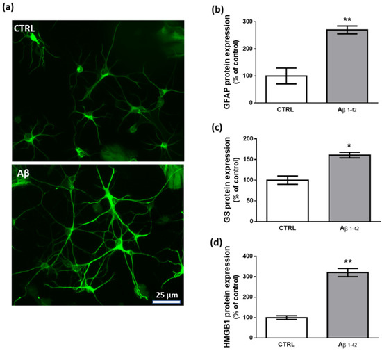 Effects of Aβ1–42 on astrocytes. (a) Representative photomicrographs of GFAP immunolabeled cells. Results from western blot experiments show increased expression of GFAP (b), GS (c), and HMGB1 (d) in astrocytes treated with human fibrillary Aβ1–42 1 µm for 48 h compared with vehicle-treated cells (CTRL). Data are plotted as mean ± SEM and expressed as percentage variations vs. CTRL. * p < 0.05; ** p < 0.01 vs. CTRL (Student’s t-test).