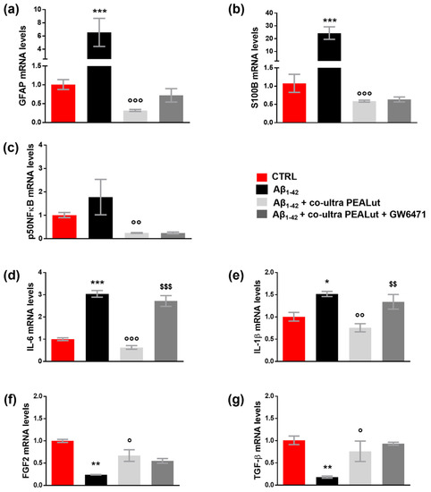 As shown in Figure 3a–e, the challenge with Aβ1–42 triggered both astrocyte reactivity and an inflammatory process, detected by the increase in GFAP, S100B, p50NFκB, IL-6, and IL-1β mRNA compared with control cells. Co-ultra PEALut significantly prevented the Aβ1–42-induced raises. Concurrent treatment with the PPAR-α antagonist GW6471 hampered co-ultra PEALut to block Aβ1–42-induced transcription of IL-6 and IL-1β, indicating PPAR-α involvement in co-ultraPEALut effects.