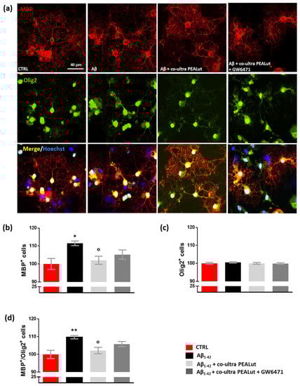 Co-ultra PEALut dampens the altered MBP+/Olig2+ ratio caused by Aβ1–42. (a) Representative photomicrographs of MBP (red) and Olig2 (green) staining of primary oligodendrocytes obtained using a 20× objective mounted on a fluorescent microscope. Cell nuclei were stained with Hoechst (blue). Scale bar is 40 μm. (b) MBP+ cell count. (c) Olig2+ cell count. (d) The ratio of MBP+ to Olig2+ cell counts. Treatments with human fibrillary Aβ1–42 1 µm in the presence or absence of co-ultra PEALut 3 µm, GW6471 3 µm (or respective vehicles) were added to the astrocytic culture medium. Semi-permeable inserts containing the primary oligodendrocytes were collected 48 h later and processed by immunofluorescence. Data are plotted as mean ± SEM and expressed as percentage variations vs. the vehicle-treated group (CTRL). * p < 0.05; ** p < 0.01 vs. CTRL; ° p < 0.05 vs. Aβ (SNK test).