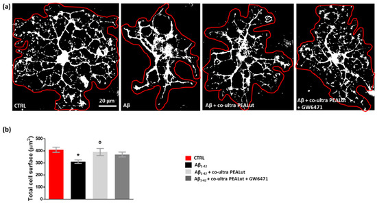 Here, we provide the very first evidence about co-ultra PEALut’s ability to restore the pathological changes occurring in both astrocytes and oligodendrocytes after a toxic insult with the human Aβ1–42. We also show that co-ultra PEALut exerts some of these effects with a mechanism mediated by the PPAR-α. The activation of PPAR-α has been linked to NFκB inhibition, reduction of proinflammatory mediators, increased transcription of antioxidant enzymes, and promotion of cell survival through the inhibition of caspase 3 []. All these pathways could theoretically explain our results; however, further experiments are needed to clarify the effects of co-ultra PEALut.