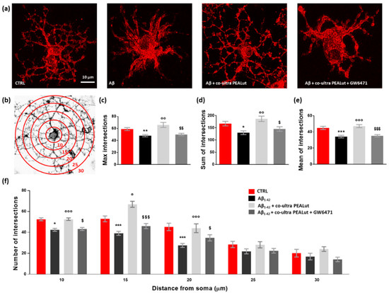 The Sholl analysis revealed a significant reduction both in the maximum number of intersections and the sum of intersections of MBP+ cell branches when oligodendrocytes were indirectly exposed to Aβ1–42 (Figure 6a–d). Similarly, the mean number of intersections was reduced (Figure 6e). Co-ultra PEALut prevented such Aβ1–42-induced modifications in oligodendrocyte morphology through PPAR-α involvement. Indeed, GW6471 blocked the observed co-ultra PEALut effect (Figure 6a,c–e). By counting the number of arborizations from the MBP+ cell soma outwards every 5 µm (Figure 6f), we found that Aβ1–42-exposed oligodendrocytes showed a lower number of arborizations at three distance measures (10, 15, and 20 µm) compared to control cells, reaching the greatest and most significant reduction at 20 µm from the soma (Figure 6f). Co-ultra PEALut treatment was effective in preventing these Aβ1–42-induced morphological changes. The co-treatment with GW6471 significantly blunted such co-ultra PEALut effect, indicating an engagement of the PPAR-α in the co-ultra PEALut mechanism of action (Figure 6f).