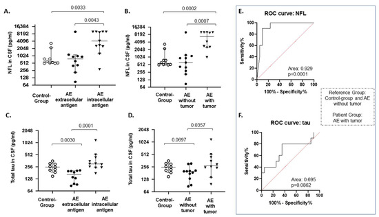 ROC curve analysis was performed to investigate the possible diagnostic utility of CSF-NFL and CSF-T-tau levels for the detection of underlying tumors. Only CSF-NFL showed an acceptable diagnostic performance; we found that CSF-NFL levels at a cut-off of 969 pg/mL could differentiate the patients with encephalitis associated with tumors from those without tumors and the controls, with an area under the ROC curve of 0.93, excellent sensitivity (100%) and moderate specificity (76%) (Figure 1E,F).