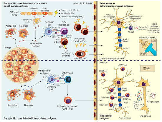 General principles of immune-pathogenesis of paraneoplastic and non-paraneoplastic autoimmune encephalitic syndromes and the role of neuronal and neuroaxonal damage biomarkers. The presence of tumor is more commonly found in autoimmune encephalitis associated with intracellular antigens (lower panel). Autoantigens expressed or released (either after apoptotic or necrotic cell death) by tumor cells are thought to initiate an autoimmune response especially after being captured by antigen-presenting cells (APCs) (e.g., dendritic cells) in peripheral lymphoid tissue (lower panel). In the absence of a tumor, the underlying pathology is obscure and the most common triggering factors are thought to be a viral infection or genetic/environmental factors affecting tissue homeostasis (upper panel). Extracellular antigens are processed and presented by APCs to CD4+ helper T cells in the context of MHC II molecules and fully activate B cells. B cells differentiate in antibody-producing plasma cells. B cells, plasma cells and IgG autoantibodies enter the central nervous system through a leaky blood–brain barrier. IgG autoantibodies have the potential to cause synaptic autoimmune disorders directly through antigen internalization, complement activation, antibody-dependent cell cytotoxicity (ADCC) and receptor blocking (upper panel). Intracellular antigens processed by APCs, in the context of MHC class I molecules and in the presence of a pro-inflammatory cytokine milieu, favor the activation of cytotoxic CD8+ effector T cells. Cytotoxic CD8 T cells invade the CNS to exert cellular neuron-directed autoimmunity via the release of perforin and granzyme B, leading to the apoptosis of the target cells (lower panel). CSF-NFL levels are elevated in cases of encephalitis associated with the presence of an underlying tumor, where cytotoxic CD8 T causes more destructive effects in the affected tissue (lower panel). CSF-NFL and tau are not elevated in patients with encephalitis associated with extracellular antigens, possibly reflecting less destructive effects of autoantibody-mediated neuroaxonal injury (e.g., dysfunction of neuronal synapsis, indicative of distinct antibody-mediated effects) (upper panel). APC = antigen-presenting cells; HLA = human leukocyte antigen; MHC = major histocompatibility complex; ADCC = antibody-dependent cell cytotoxicity; NFL = neurofilament, HSV = herpes simplex virus; BCR = B cell receptor, TCR = T cell receptor.