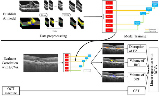 Nevertheless, most papers focused mainly on segmentation methods, lacking a correlation with visual acuity. In this study, we developed a deep learning-based automatic segmentation algorithm to segment the IRC, SRF, and EZ. We evaluated the correlations of these segmented factors and CST, which are used in current clinical practice, with BCVA. We demonstrated that the results of our fully automatic segmentation were consistent with the previous manual segmentation research on OCT features that correlated with BCVA [4].