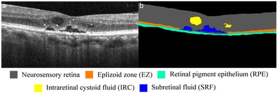 (a) OCT image of retina of patient with DME. (b) Segmentation of OCT image indicating, through color coding, different retinal structures and features.