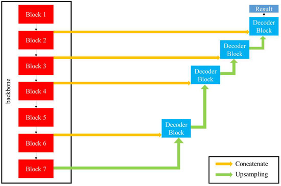 Architecture of proposed model. Decoder block is the same as that of U-net, and the backbone is EfficientNet-B5, which is composed of seven blocks.