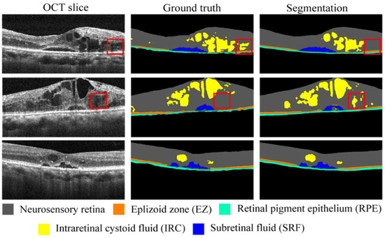 Three randomly selected examples of raw images, manually segmented images (ground truth), and automatically segmented images (segmentation images) from the testing data set are displayed in Figure 4. The five retinal structures and features (neurosensory retina, EZ, RPE, IRC, and SRF) are color-coded and presented in the figure (middle and right columns for manual and automatic segmentation results, respectively). The red boxes indicate the differences in the images between the ground truth and automatic segmentation for IRC. Such differences may be caused by blurred boundaries (as displayed within the red boxes in the OCT slices in the left column). In addition to the IRC results, the results for the neurosensory retina, EZ, RPE, and SRF are highly consistent between the ground truth and segmentation images.