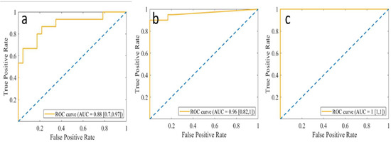ROC curves of (a) EZ disruption, (b) IRC, and (c) SRF. Blue dotted lines indicate AUC = 0.5. EZ: ellipsoid zone; IRC: intraretinal cystoid fluid; SRF: subretinal fluid.