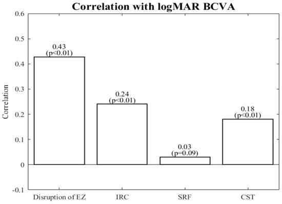 The correlations of the retinal features with BCVA are shown in Figure 6. The correlations for EZ disruption and IRC and CST volume were significant, with the strongest for EZ disruption. The volume of SRF was the most weakly correlated with BCVA, and this was the only correlation that was nonsignificant. Moreover, IRC was more correlated with BCVA than CST. However, the correlations between all these retinal features and BCVA were less than 0.5.