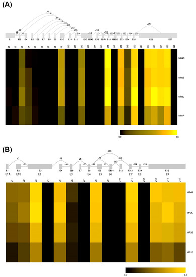 Predicted splice graph and splice junction expression for NR3C1 (A) and NR3C2 (B). Heatmaps are based on splice junction expression on a log2(FPKM + 1) scale. Grey boxes indicate annotated transcript features. Introns are not drawn to scale.