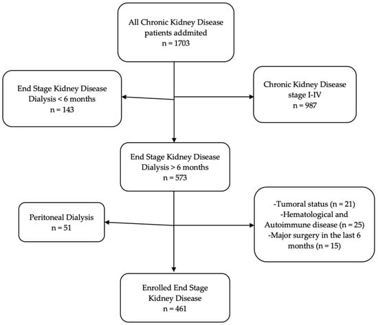 During the study period, 1703 patients with CKD were admitted. Of these, 987 patients were CKD stage I-IV, 143 were ESKD with less than 6 months of RRT, 51 patients with PD, 21 had tumoral status, 25 had autoimmune or hematological diseases, and 15 had major surgery in the previous 6 months. Four hundred sixty-one patients with ESKD who met all the criteria were included in the study (Figure 1).