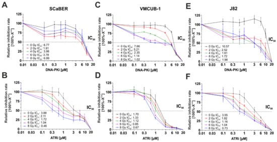 IC50 values of ATR and DNA-PK inhibitors in relation to radiation dose and cellular background. Short-term single drug response analyses applying DNA-PK and ATR inhibitors upon different radiation doses (0 Gy, 2 Gy, 4 Gy, 6 Gy, 8 Gy) on squamous SCaBER (A,B), urothelial VMCUB-1 (C,D) and J82 (E,F) bladder cancer cell lines. Semi-logarithmic plots show drug response curves (relative inhibition rate = 100% − Xinh) of urothelial bladder cancer cell lines. Drug response was determined using XTT following 72 h incubation with indicated drug concentrations and radiation doses. Dotted line and stated relative IC50 = drug concentration causing 50% inhibition. Drug response curves represent means from at least n = 3 independent experiments.