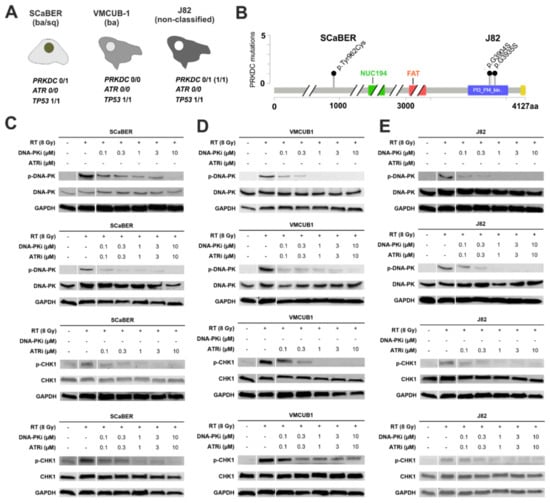 NGS-based exome-sequencing provided detailed information regarding mutations in DDR genes, in particular for our targets PRKDC and ATR, as well as TP53 (Figure 2A,B). For PRKDC, encoding the catalytic subunit of DNA-PKcs, a monoallelic single-nucleotide variation was shown to be present in squamous-like SCaBER (p.Tyr962Cys, not reported so far) and two different monoallelic single nucleotide variations in urothelial J82 (p.Gly3935Ser, p.Gly3904Ser, uncertain significance) cancer cells. The urothelial basal-type VMCUB-1 cell line showed no PRKDC alterations. All three cancer cell lines were characterized by an ATR wildtype gene but possessed biallelic TP53 mutations. In SCaBER and VMCUB-1 cells, TP53 alterations were verified as pathogenic variants (SCaBER: p.Arg71Leu and p.Arg110Leu; VMCUB-1: p.Arg16His, p.Arg175His, p.Arg43His, p.Arg136His). The TP53 mutation (p.Glu271Lys) confirmed in J82 was of uncertain significance since there are conflicting interpretations of pathogenicity (see Supplementary Table S1). The normal urothelial cell line UROtsa showed no TP53 mutation (data not shown).