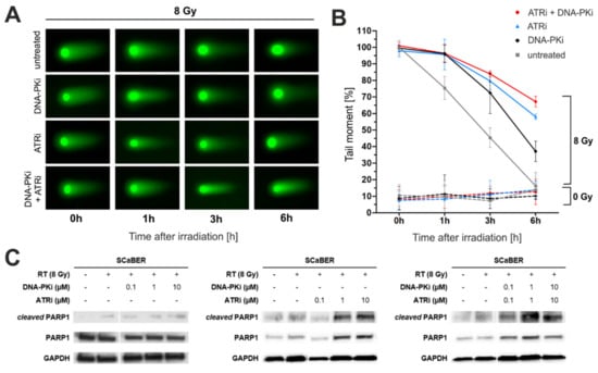 Next, we showed substantially blocked DNA repair upon DNA-PKi and ATRi treatment in squamous SCaBER cells by calculating the dimension of tail moments of comet assays 1–6 h after IR (Figure 3A). Interestingly, the dual treatment of DNA-PKi and ATRi was most efficient in retarding the DNA damage response (DNA damage remaining after 6 h: 67.02%) followed by individual ATRi (DNA damage remaining after 6 h: 58.81%) and DNA-PKi (DNA damage remaining after 6 h: 33.99%) application (Figure 3B). During this period, SCaBER cells without drug treatment repaired more than 85% of damaged DNA lesions (i.e., DNA damage remaining after 6 h: 14.52%). Effects of DNA-PKi and ATRi alone (i.e., without ionizing radiation) on DNA, potentially causing damage or interfering with DNA damage repair, could be excluded. We then analyzed the cleavage of PARP1 as an apoptotic marker [] in SCaBER cells after single and dual DNA-PK1 and ATRi treatment with and without IR (Figure 3C). Cleaved PARP1 was predominant upon higher doses of ATRi and combined DNA-PKi-ATRi application, while single DNA-PKi treatment showed only a mild effect on PARP1 activation.