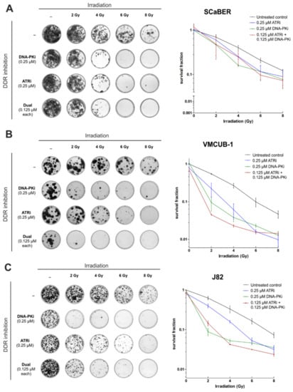 Pelvic radiotherapy is known to cause unavoidable exposure of the bladder, urethra, bone marrow and distal ureters to radiation which subsequently leads to many inevitable radiation-associated complications []. To improve the therapeutic ratio of potential bladder cancer treatment, we focused on DNA repair pathways known to affect resistance to DNA-damaging chemotherapy and radiotherapy []. We used novel small molecule inhibitors targeting key proteins of DNA damage response pathways [], such as DNA-PK, as an emerging therapeutic target in cancer []. Similar compounds of these novel classes of drugs targeting ATR and DNA-PK have already demonstrated a radiosensitizing effect in various types of cancer cells [,,,,,]. Previously, Dillon et al. studied the ATR inhibitor AZD6738 (Ceralasertib) in DNA-PK deficient NOD SCID gamma mice, demonstrating an appropriate tolerance of this drug []. Fok and colleagues confirmed that AZD7648 is a potent and selective DNA-PK inhibitor in various cell lines []. To date, the impact of DNA-PK and ATR inhibition on bladder cancer cells has remained unknown. Herein, we provide functional evidence that treatment with both DNA-PKi (AZD7648) and ATRi (AZD6738; Ceralasertib) resulted in radiosensitization of bladder cancer cells of various histological/molecular subtypes, i.e., in squamous (SCaBER), in urothelial basal (VMCUB-1) and in urothelial non-classified (J82) cells.