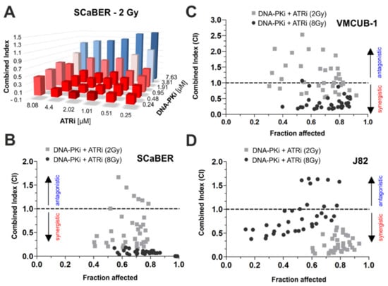 Dual ATR and DNA-PK inhibition mediates short-term synergistic effects depending on radiation dose and cellular background. The combination index (CI) was calculated in order to assess the combined effects of drugs (CompuSyn software, v.1.0). (A) 3D graph illustrates CI results for combined application of dual DNA-PK and ATR inhibition upon low dose irradiation of SCaBER cells. Drugs were used at concentrations of 4 × IC50, 2 × IC50, 1 × IC50, 0.5 × IC50, 0.25 × IC50, 0.125 × IC50 of each drug for SCaBER. CI = 1: additive effect, CI < 1: synergistic effect (red), CI > 1: antagonistic effect (blue). (B–D) Graphs illustrating CI results for cell fractions affected by dual application of DNA-PK and ATR inhibitors in combination with two distinct radiation doses (low 2 Gy and high 8 Gy) on SCaBER (B), VMCUB-1 (C) and J82 (D) cells after 72 h. CI data represents means from at least n = 3 independent experiments.