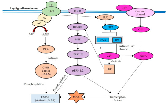 Besides the cAMP-PKA and PLC-PKC cascade inducer, activation of the epidermal growth factor receptor (EGFR) by extracellular stimuli, including cytokines, growth factor, ligands, and transforming agents is also involved in StAR protein regulation [,]. This event is known as the cAMP-independent pathway. This initiates a cascade of protein kinases, including Ras/Raf and other highly similar kinases. These protein kinases then activate a variety of transcription factors, subsequently being phosphorylated. Phosphorylation of these transcription factors regulates the StAR gene and consequently steroid production. Besides its function in StAR protein and steroid synthesis, ERK1/2 also phosphorylates the StAR protein to promote cholesterol mobilization in the synthesis of steroid hormones [,].