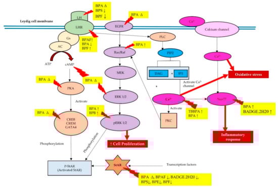 Calcium-regulated signal transduction acts as a second messenger in the regulation of sex steroid hormone production, specifically targeting the StAR protein. BPA and its analogues can also interfere with the Ca2+ transduction system by increasing the influx and concentration of Ca2+ and Nur77 expression in ex vivo and in vitro models. From the collected data, Ca2+ concentration after exposure to BPA and its analogue is shown to consistently increase. Ca2+ plays a critical role in stimulating StAR via its StAR protein transcription ability. However, an increase in Ca2+ upon BPA exposure may not trigger StAR transcription but is involved in oxidative stress in the mitochondria. The increased concentration of Ca2+ can stimulate the formation of ROS in the mitochondria during respiration, leading to oxidative stress []. Ca2+ in Leydig cells can stimulate Nur77 expression, which has a role in the stimulation of StAR protein expression and transcription. In addition, all the findings showed an increased in Nur77 expression after BPA exposure. Theoretically, the increase of Nur77 expression will increase the inactive form of the StAR protein. Usually, the StAR protein should be activated for it to function via phosphorylation. Hence, exposure to BPA and its analogues may only increase the inactivated form of the StAR protein, leading to a reduction in its function for cholesterol mobilization. Furthermore, the elevated Nur77 expression has been reported to be involved in inflammation. Such Nur77 may switch its role from being involved in StAR expression and transcription to the inflammatory response [].