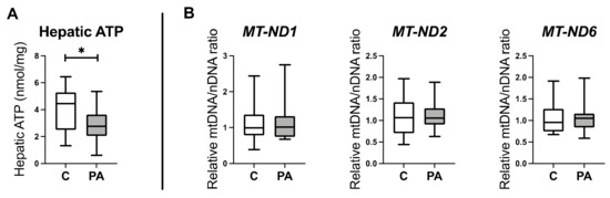 Prenatally androgen-exposed males have a decreased hepatic ATP level that is independent of mitochondria number. (A) Hepatic ATP level in adolescent prenatally androgen-exposed males (PA; n = 14) and control males (C; n = 14). (B) Relative copy number of mitochondrial DNA to nuclear DNA in adolescent prenatally androgen-exposed males (PA; n = 14) and control males (C; n = 14). Differences were analyzed by unpaired, two-tailed t-test. (* p < 0.05). Box-plot whiskers are lowest and highest observed values, and box is the upper and lower quartile, with median represented by line in box.