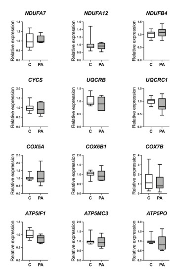 Decreased expression of OXPHOS genes is not evident in fetal life. Expression of selected hepatic OXPHOS genes, identified as differentially expressed during adolescence, was examined by using qRT-PCR in control (C; n = 10) and prenatal androgen excess (PA; n = 6) male fetal livers (day 90 of gestation). Differences were analyzed by unpaired, two-tailed t-test. Box-plot whiskers are lowest and highest observed.