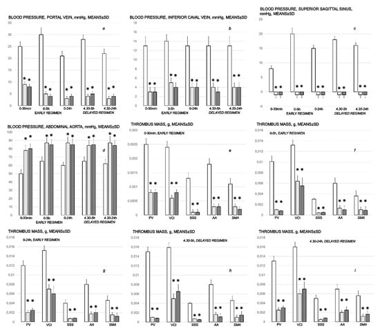 Blood pressure assessment, portal (a), caval (b) and intracranial (superior sagittal sinus) (c) hypertension, and aortal hypotension (d) in mmHg at the end of the ligation time period of 30 min, 5 h, and 24 h. Timeline of the thrombosis development in portal vein (PV), inferior caval vein (ICV), superior sagittal sinus (SSS), abdominal aorta (AA) and superior mesenteric artery (SMA) at the end of the ligation time period of 30 min, 5 h, and 24 h, as an early regimen at 0–30 min (e), 0–5 h (f), and 0–24 h (g) application-sacrifice period, and as delayed regimen at 4.30 h–5 h (h) and 5 h–24 h (i) application-sacrifice period. Therapy included BPC 157 (10 μg/kg (light gray bars) or 10 ng/kg (dark gray bars)) or saline (5 mL/kg) (white bars) as an intragastric administration either immediately following ligation, or as an early regimen, for assessment at 30 min, 5 h and 24 h-ligation time. As a delayed regimen, the therapy was given as an intragastric administration at 4.30 h ligation time for assessment at 5 h ligation time, or as oral administration, continuously in drinking water from 5 h ligation time until sacrifice at 24 h ligation time. Means ± SD, * p ˂ 0.05, at least, vs. control.
