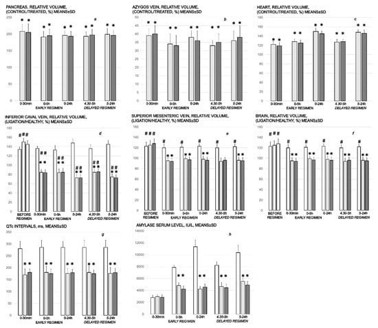 Timeline of relative volume (a–f) of the QTc intervals, ms (g), and serum amylase level, IU/L (h). Presentation of the relative volume of the pancreas (a), azygos vein (a), heart (c), inferior caval vein (d), superior mesenteric vein (e), and brain (f) to illustrate the effect on pancreas swelling, brain swelling, heart dilatation, superior mesenteric vein and inferior vein congestion, azygos vein failure, and counteraction as control/treated % or ligation/healthy % at the end of the ligation time period of 30 min, 5 h, and 24 h, as an early regimen at 0–30 min (e), 0–5 h (f), and 0–24 h (g) of application-sacrifice period, and as delayed regimen at 4.30 h–5 h (h) and 5 h–24 h application-sacrifice period. Therapy included BPC 157 (10 μg/kg (light gray bars) or 10 ng/kg (dark gray bars)) or saline (5 mL/kg) (white bars) as an intragastric administration either immediately following ligation or as an early regimen, for assessment at 30 min, 5 h and 24 h ligation time. As a delayed regimen, the therapy was given as an intragastric administration at 4.30 h ligation time for assessment at 5 h ligation time, or as oral administration, continuously in drinking water from 5 h ligation time until sacrifice at 24 h ligation time. Means ± SD, * p ˂ 0.05, at least, vs. control, # p ˂ 0.05, at least, vs. healthy.