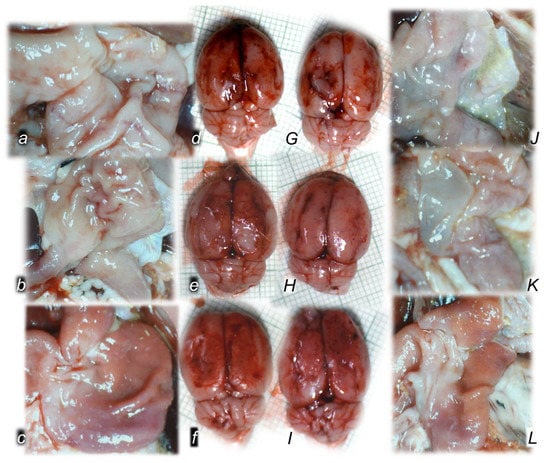 Stomach lesions and swollen brain in rats with occluded bile duct. Regular timeline (30 min (a,d), 5 h (b,e) and 24 h (c,f) ligation time period) of the stomach lesions’ presentation (a–c) and swollen brain (d–f) in controls. Upon BPC 157 therapy and recruitment of the defensive pathways, brain swelling (0–30 min (G), 0–5 h (H), 0–24 h (I) application sacrifice period) and gastric lesions (0–30 min (J), 0–5 h (K), 0–24 h (L) application sacrifice period) were counteracted. Illustrative presentation included BPC 157 (10 ng/kg) or saline (5 mL/kg) as an intragastric administration immediately following ligation, as an early regimen. A similar presentation also included the effect of the delayed regimen.