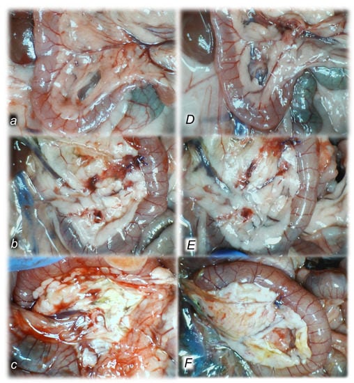 Regular timeline (30 min (a,D), 5 h (b,E) and 24 h (c,F) ligation time period) of disturbed pancreas presentation in controls (a–c). Upon BPC 157 therapy and recruitment of the defensive pathways, pancreas swelling and lesions (D–F) at 30 min (D), 5 h (E) and 24 h (F) ligation time period were counteracted. Illustrative recovered presentation included BPC 157 (10 ng/kg) or saline (5 mL/kg) as an intragastric administration, either immediately following ligation, as an early regimen (0–30 min (D), 0–24 h (F)), or as delayed regimen (4.30 h–5 h (E) application sacrifice period).