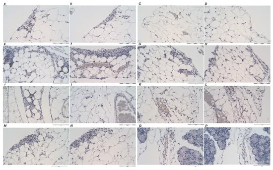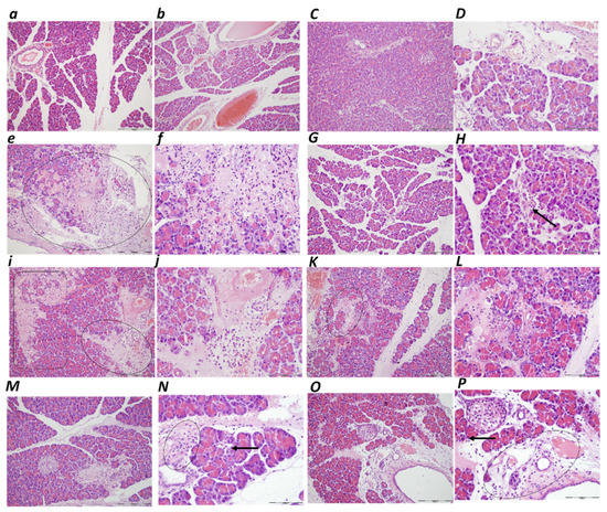 Pancreas lesion illustrative microscopic presentation in rats with obstructed bile duct (a–P) at the end of the ligation time periods of 30 min, 5 h, and 24 h; as an early regimen at 0–30 min (a–D), 0–5 h (e–H), and 0–24 h (i–L) application sacrifice period; and as a delayed regimen at 4.30 h–5 h (M,N) and 5 h–24 h (O,P) application sacrifice period in controls (a,b,e,f,i,j) and BPC 157-treated rats (C,D,G,H,K,L–P). (a,b) (Control, 0–30 min) Diffuse edema of interlobar septe, interlobular septe, interacinal spaces and focal expansion of intercellular spaces. Perivascular infiltration 6–10 leukocytes/HPF. (C,D) (BPC 157, 0–30 min) Focal edema of interlobar septe. No acinar necrosis, hemorrage, fat necrosis, inflammation or perivascular infiltrate. (e,f) (Control, 0–5 h) Diffuse edema of interlobar septe and interacinal spaces, and focal expansion of intercellular spaces, a diffuse occurrence of 5–10 necrotic acinar cells, a focal occurrence of 11–16 necrotic cells/HPF (black arrow), up to 2 foci of hemorrhage, up to 4 foci of fat necrosis (marked area), and perivascular infiltration 16–20 leukocytes/HPF. (G,H) (BPC 157, 0–5 h) Focal edema of interlobar septae. Focal occurence of 1–4 necrotic acinar cells/HPF (black arrow). No hemorrage and fat necrosis. Perivascular infiltration 2–5 leukocytes/HPF. (i,j) (Control, 0–24 h) Diffuse edema of interlobar septe, interlobular septe, interacinal spaces and focal expansion of intercellular spaces. More than 16 necrotic acinar cells/HPF (extensive confluent necrosis) (marked area). More than 8 foci of hemorrhage. Up to 7 foci of hemorrage and fat necrosis (marked area). Perivascular infiltration >30 leukocytes/HPF. (K,L) (BPC 157, 0–24 h) Focal edema of interlobar septe. Diffuse occurence of 1–4 necrotic acinar cells and focal occurrence of 15–10 necrotic cells/HPF. One focus of hemorrhage or fat necrosis (marked area). Perivascular infiltration 6–10 leukocytes/HPF. BPC 157 delayed regimens (M–P). (M,N) (BPC 157, 4.30 h–5 h) Focal edema of interlobar septe. Diffuse occurrence 5–10 necrotic cells/HPF (black arrow) and focal occurrence 11–16 necrotic cells/HPF. Up to one focus of hemorrhage, and up to 7 foci of fat necrosis, mostly in the pancreatic tail, while pancreatic head was not affected with fat necrosis. Perivascular infiltration >30 leukocytes/HPF (marked area). (O,P) (BPC 157, 5 h–24 h) Focal edema of interlobar septe. Diffuse occurrence 5–10 necrotic cells/HPF (black arrow) and focal 11–16 necrotic cells/HPF. Up to one focus of hemorrhage, and up to 7 foci of fat necrosis, mostly in the pancreatic tail, while pancreatic head was not affected with fat necrosis. Perivascular infiltration >30 leukocytes/HPF (marked area). (HE staining; magnification 200×; scale bar 200 μm; (a,C,e,G,i,K,M,O); (HE staining; magnification 400×; scale bar 100 μm; (b,D,f,H,j,L,N,P).