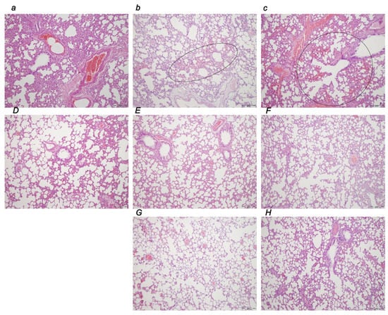 The same scoring system as in the previous studies [,,,,,,,,] was used to grade the degree of lung injury in lung tissue analysis. Each of the features (i.e., focal thickening of the alveolar membranes, congestion, pulmonary edema, intra-alveolar hemorrhage, interstitial neutrophil infiltration, and intra-alveolar neutrophil infiltration) was scored (0–3) as absent (0) or present to a mild (1), moderate (2), or severe (3) degree, and a final histology score was determined.
