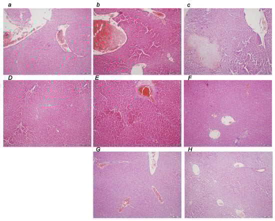 As described in the previous studies [,,,,,,,,], evaluation was made by light microscopy using an Olympus 71 digital camera and an Olympus BX51 microscope (OLYMPUS Europa SE & CO. KG). Digital images were saved as uncompressed 24-bit RGB TIFF files using the software program AnalySIS (Olympus Soft Imaging System GmbH, Munster, Germany). Representative tissue specimens (i.e., the brain, liver, kidney, pancreas, stomach, small and large intestine, lungs, and heart taken at the end of the experiment, fixed in 10% neutral buffered formalin (pH 7.4) at room temperature for 24 h) were embedded in paraffin, sectioned at 4 μm, and stained with hemalaun and eosin (H&E).