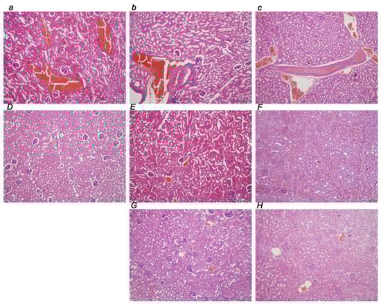 The same scoring system as in the previous studies [,,,,,,,,] was used to grade renal (i.e., the degeneration of Bowman’s space and glomeruli, degeneration of the proximal and distal tubules, vascular congestion, and interstitial edema), liver (i.e., vacuolization of hepatocytes and pyknotic hepatocyte nuclei, activation of Kupffer cells, and enlargement of sinusoids) and heart (i.e., dilatation and congestion of blood vessels within the myocardium and coronary arteries) histology. Each specimen was scored using a scale ranging from 0–3 (0: none, 1: mild, 2: moderate, and 3: severe) for each criterion, and a final histology score was determined (0: none, 1: mild, 2: moderate, and 3: severe).