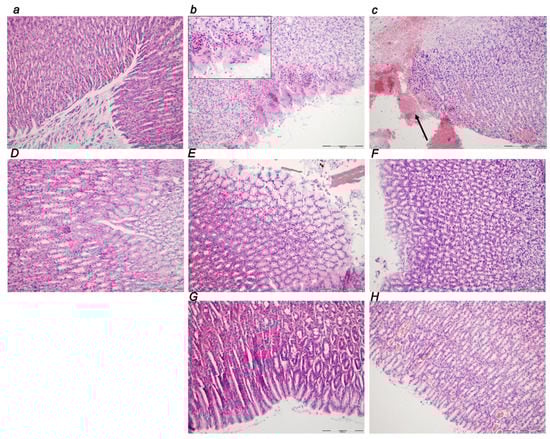 - Stancic-Rokotov, D.; Sikiric, P.; Seiwerth, S.; Slobodnjak, Z.; Aralica, J.; Aralica, G.; Perovic, D.; Anic, T.; Zoricic, I.; Buljat, G.; et al. Ethanol gastric lesion aggravated by lung injury in rat. Therapy effect of antiulcer agents. J. Physiol. Paris 2001, 95, 289–293. [Google Scholar] [CrossRef]